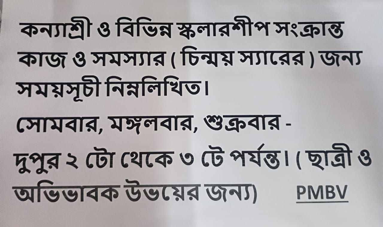 কন্যাশ্রী ও বিভিন্ন স্কলারশীপ সংক্রান্ত কাজ ও সমস্যার (চিন্ময় স্যারের) জন্য সময়সূচী নিম্নলিখিত।